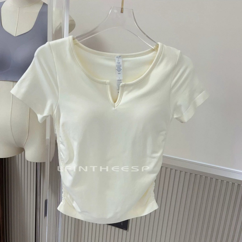 蔓朵奇冰淇淋褶皱泡泡短袖带胸垫打底女士T恤收腰运动V领纯色吸汗排湿