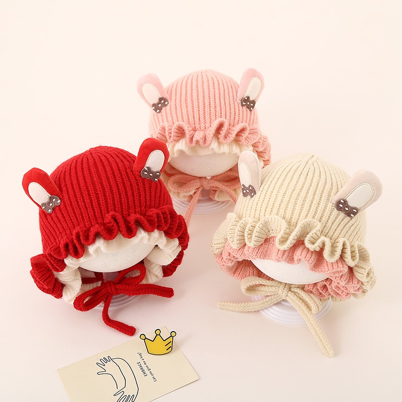 哆宝时代2024兔耳朵儿童毛线帽冬季户外时尚波浪边加厚保暖婴幼儿针织帽子