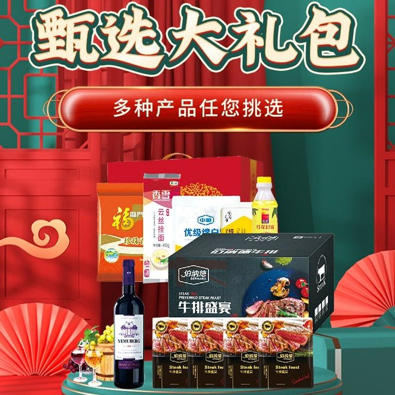 甄选大礼包年货礼盒 月幕堡葡萄酒 伯纳德精品牛排 中粮大米杂粮组合