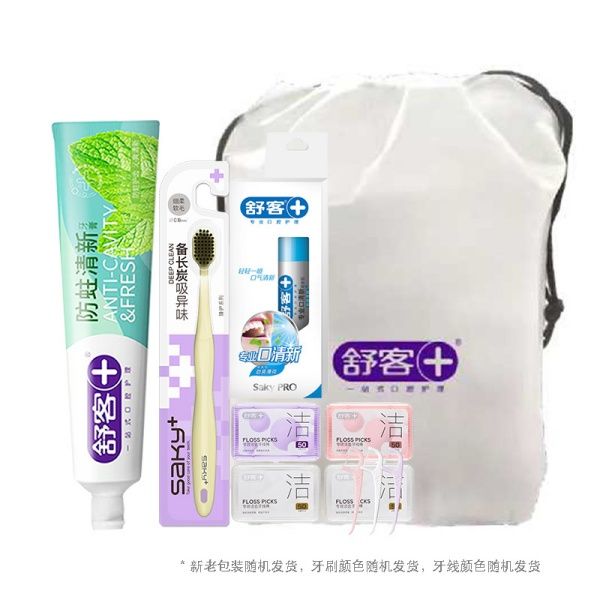 舒客 逍遥套装 ZHS-TX22 沁爽防蛀清牙膏145g+宽头密炭沁爽牙刷+专效口清18ml+洁齿牙线棒