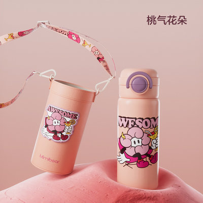 眯眯熊(Mimibear)316不锈钢双饮弹跳保温杯 粉色桃气朵朵 500ml 【送杯套、背带绳】