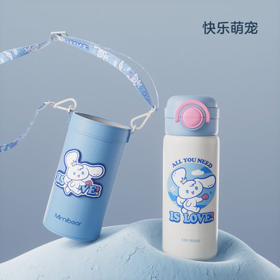 眯眯熊(Mimibear)316不锈钢双饮弹跳保温杯 粉蓝快乐萌宠 500ml 【送杯套、背带绳】