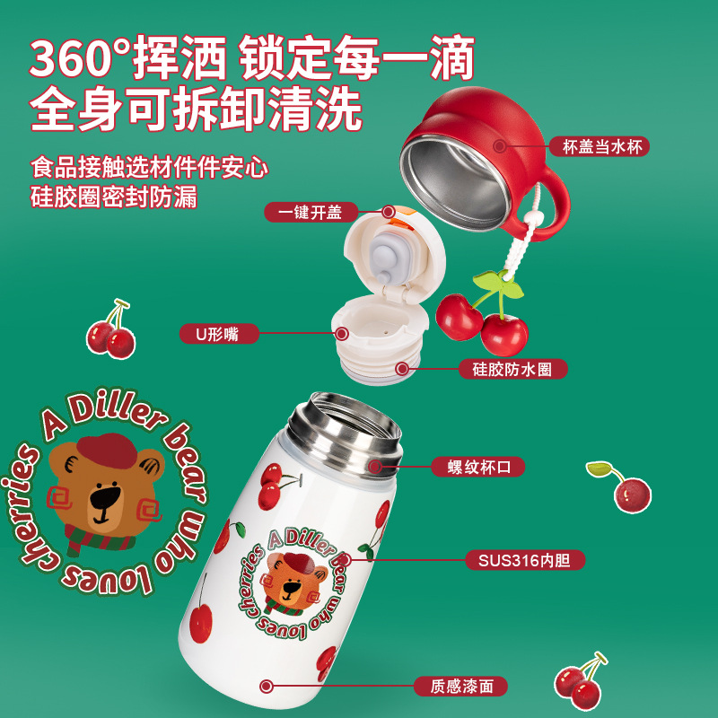 迪乐贝尔新品樱桃系列保温杯高颜值便携双饮水杯女士随行杯子小学生礼品保温水杯子