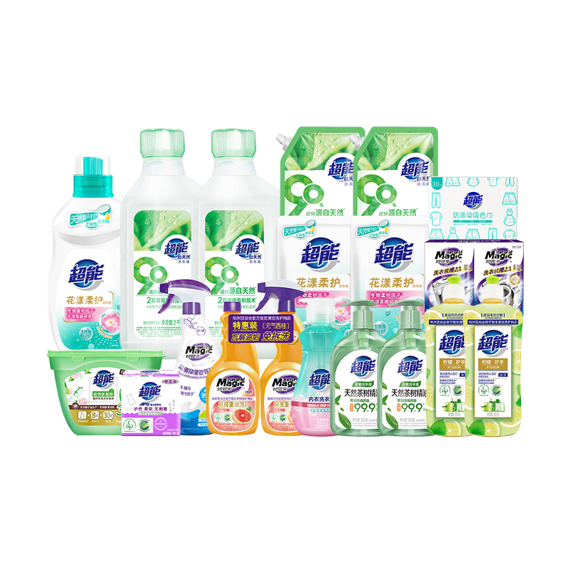超能/妙管家 家庭清洁洗护组合11940g+30片(超能自天然洗衣液2kg*2+超能花漾柔护洗衣液(非单卖品)1kg+超
