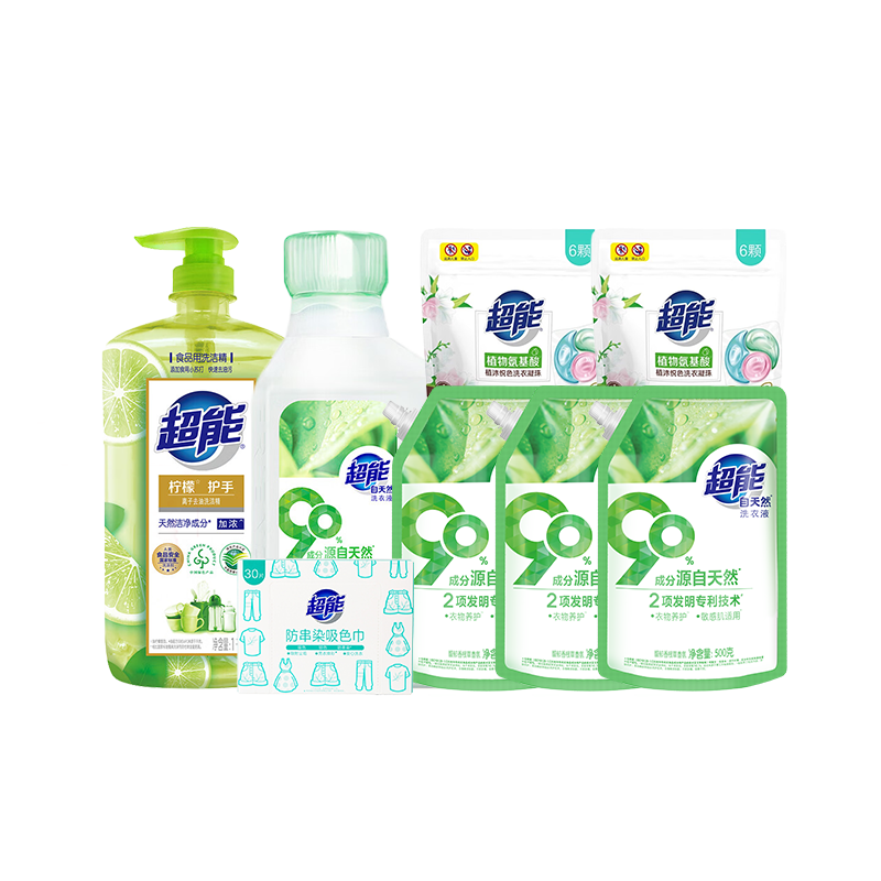 超能 家庭清洁组合3620g+30片(超能自天然洗衣液1kg+超能自天然洗衣液(带出液口D)500g*3+超能离子去油洗