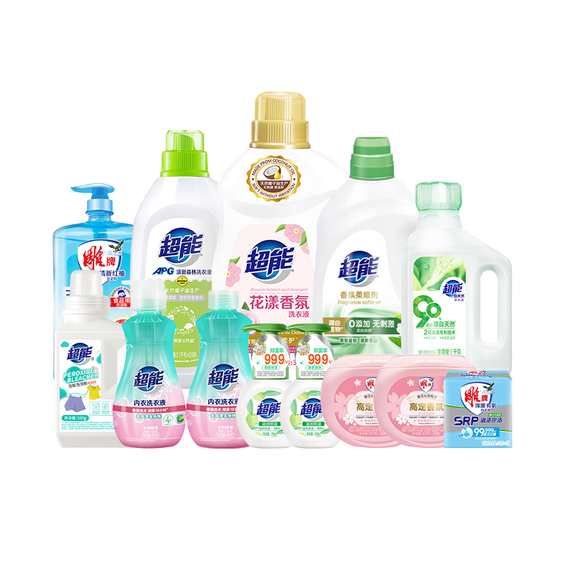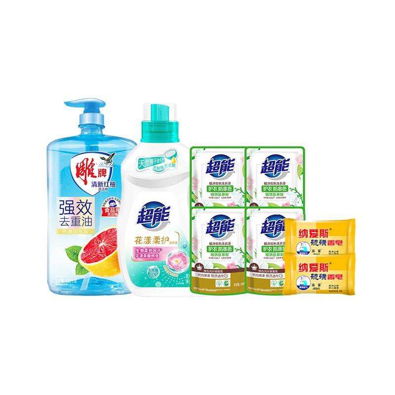 超能/雕牌 小规格清洁组合2610g(超能植沐悦色洗衣液100g*4袋+纳爱斯硫磺药皂90g*2+1kg超能花漾柔护洗衣