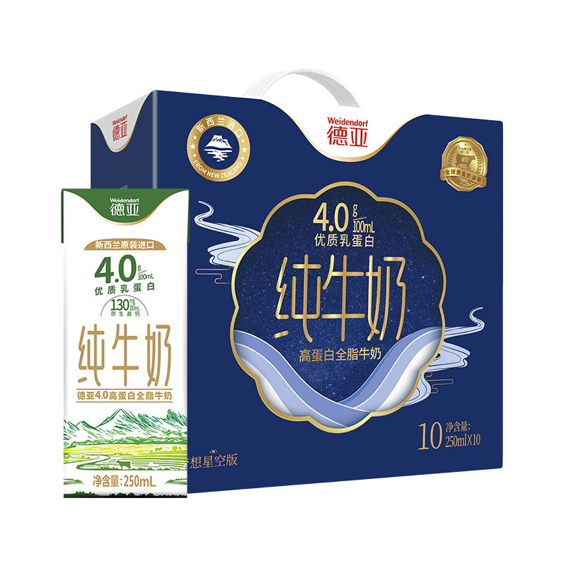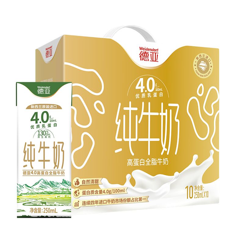 德亚 新西兰原装进口高蛋白4.0全脂牛奶250ml*10纯牛奶液态纯牛奶中老年学生儿童水奶