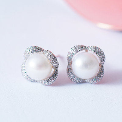 饰瑾美(SHIJINMEI)四叶草珍珠耳钉 银色