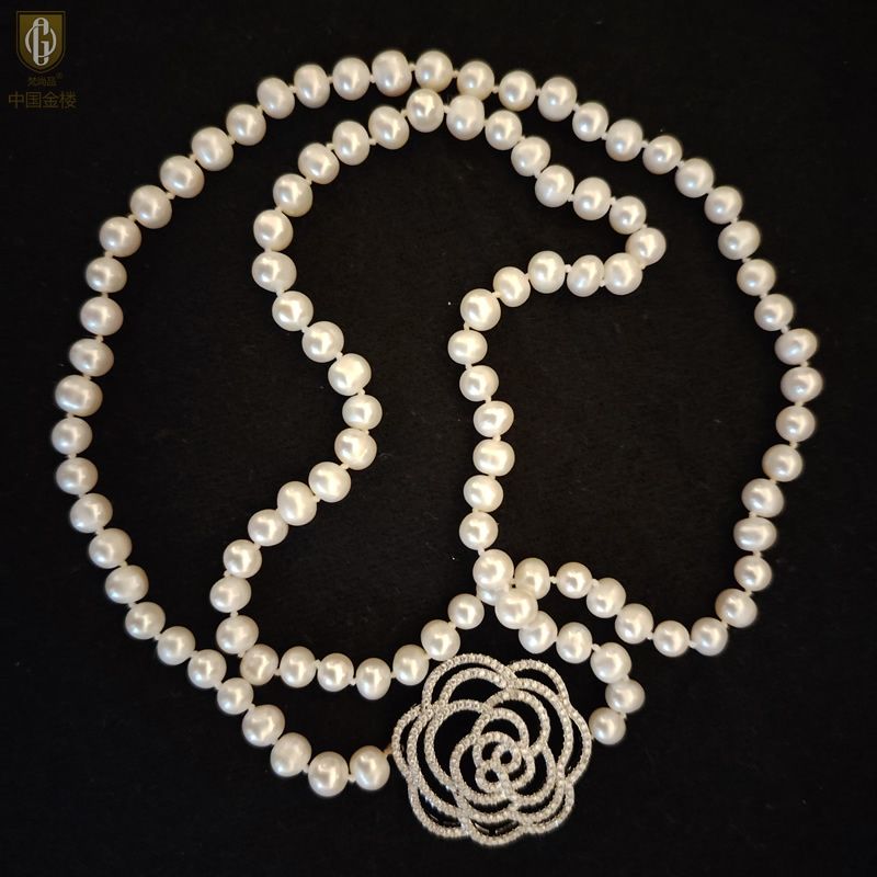 中国金楼梵尚品近圆天然深水珍珠豪镶满钻白玫瑰毛衣链ZZX38619159送礼送女友(下单赠手机贴随机一个)