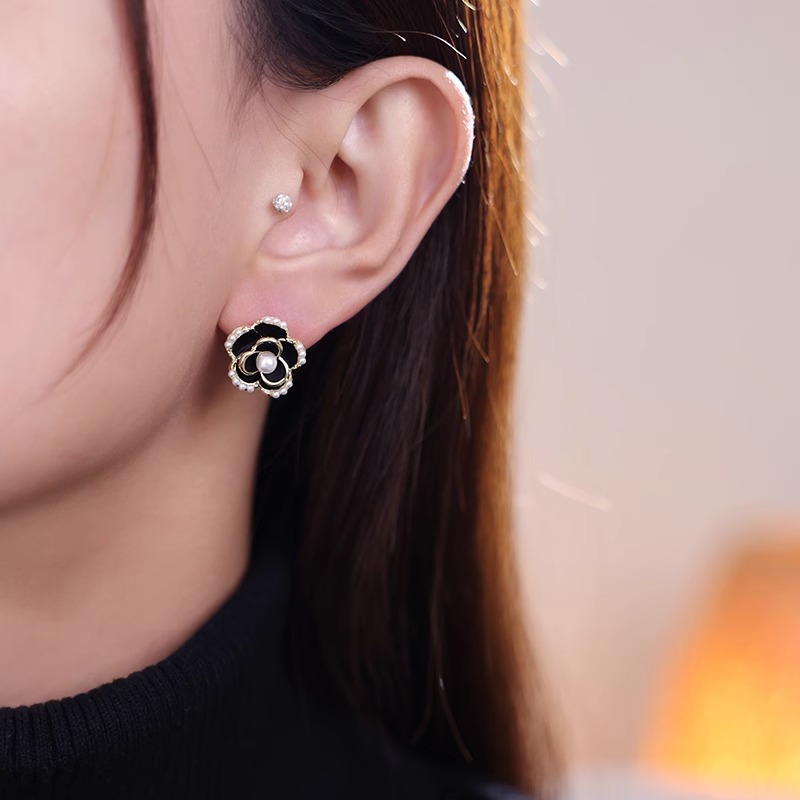 彤彤兔 S925银针黑色山茶花耳钉女小众高级设计感简约珍珠耳环法式耳饰品