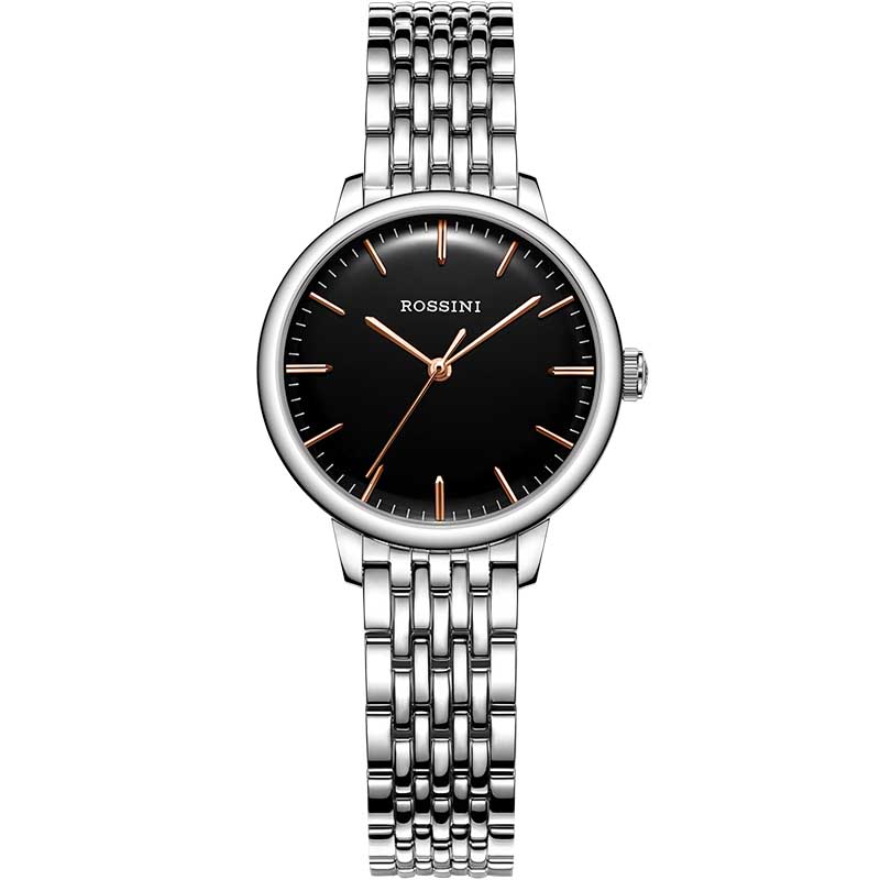 Rossini罗西尼 启迪系列 机械手表情侣款黑盘钢带女表6444W04A