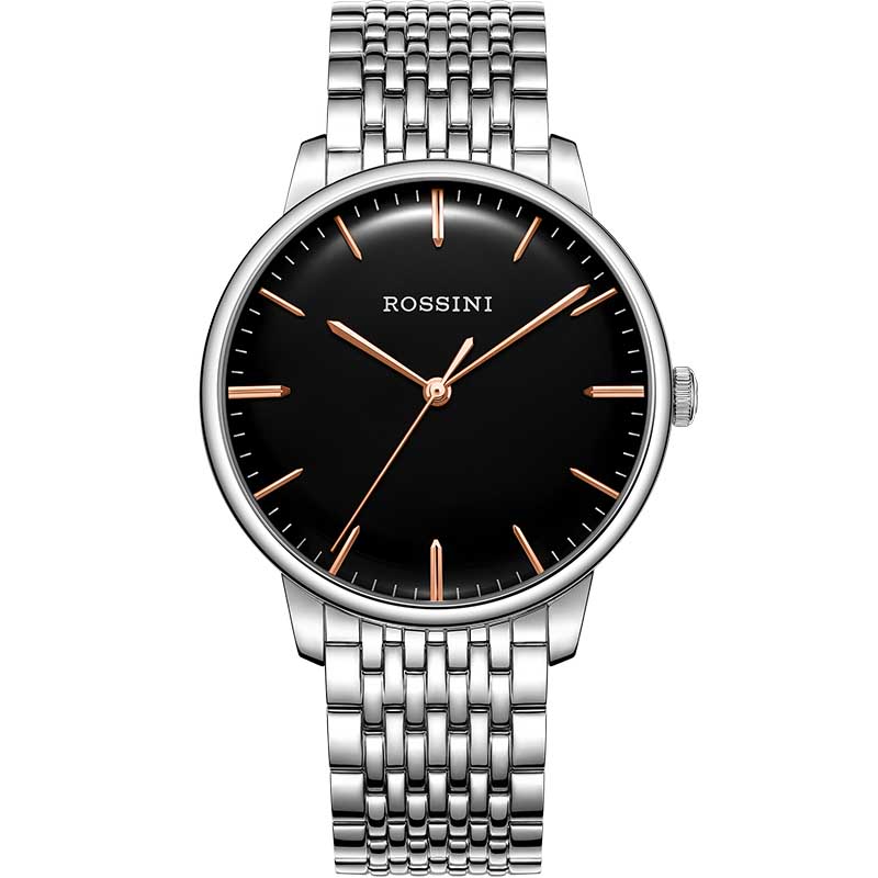 Rossini罗西尼 启迪系列 机械手表情侣款黑盘钢带男表6443W04A