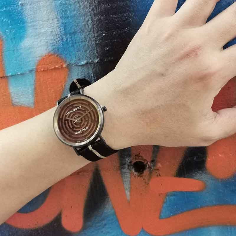 MENDEXT漫狄红檀实木精雕表面黑色表壳红色/浅黄织纹表带男女学生运动手表