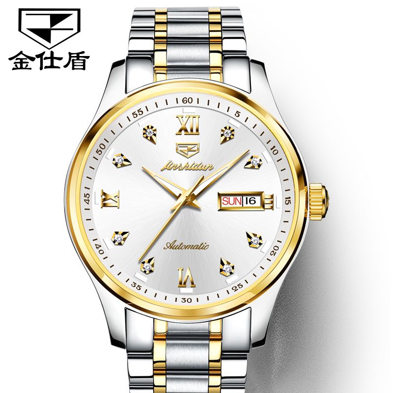 金仕盾手表男女防水全自动机械商务防水夜光双日历钨钢手表 - 金8813