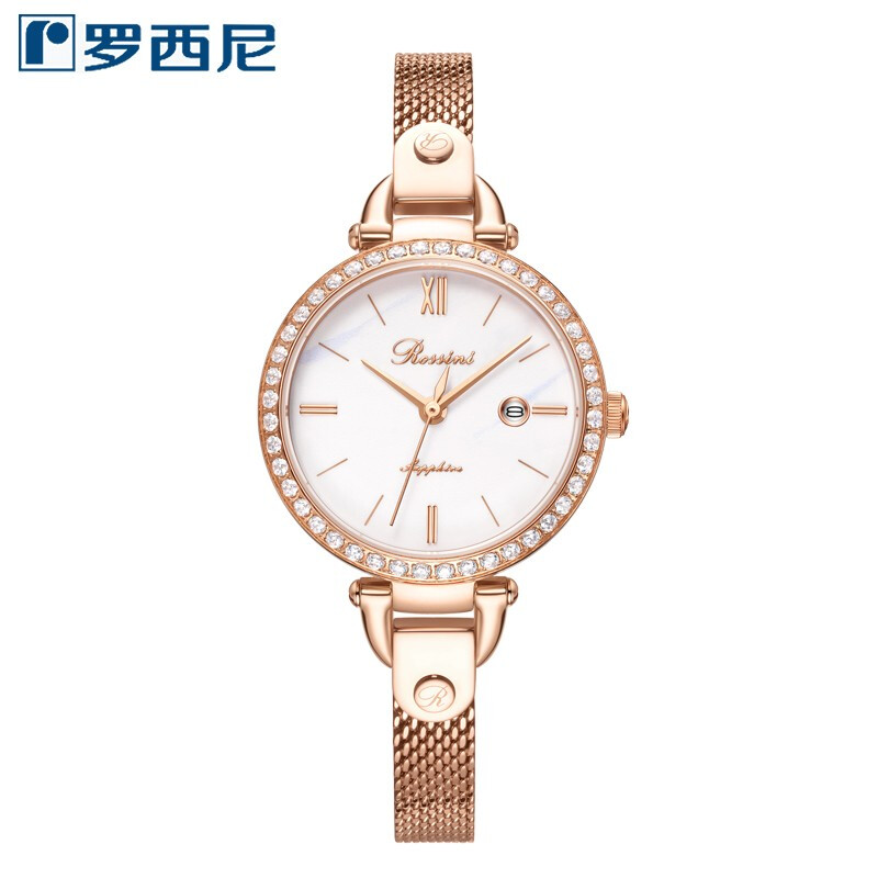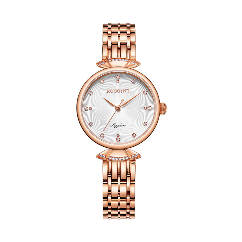 Rossini罗西尼 典美系列【专柜同款】时尚防水石英手表白盘玫瑰金钢带女表5924G01B