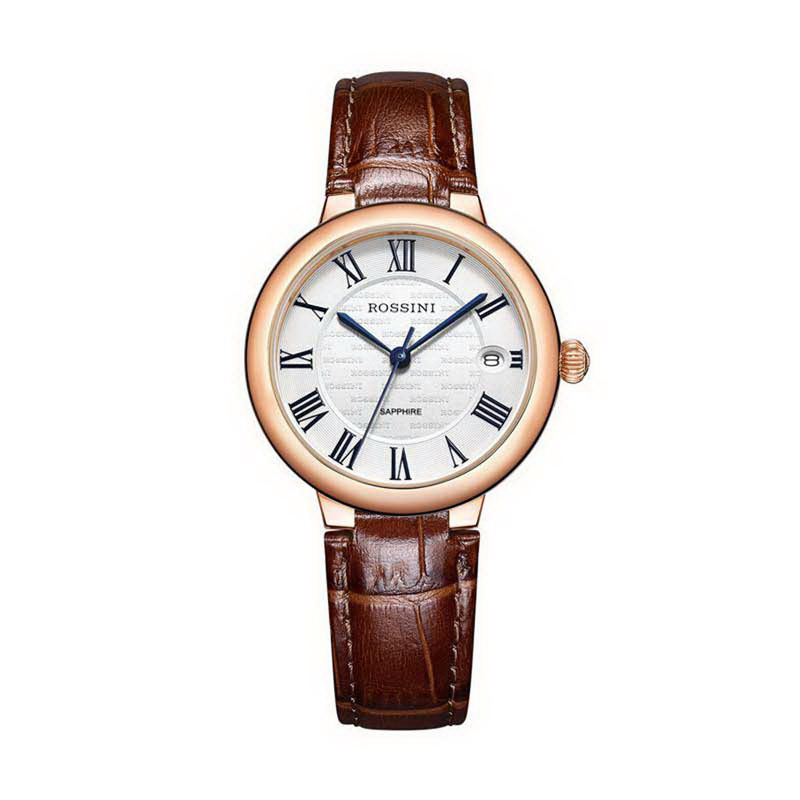 Rossini罗西尼 雅尊商务系列 复古简约罗马刻度日历石英女士手表 棕皮女表5806G01D