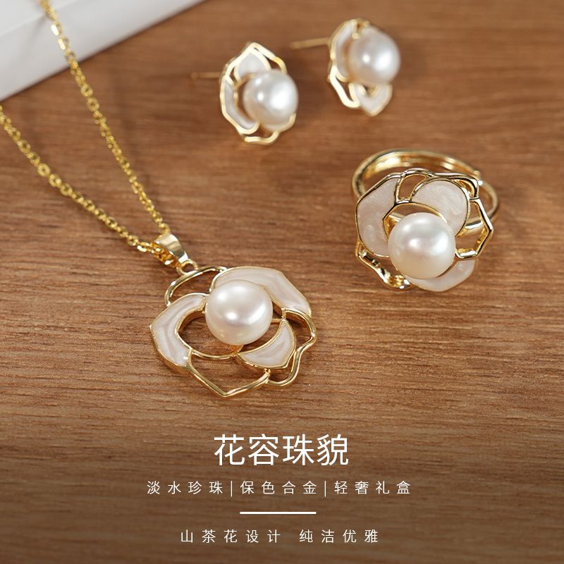 (附证书)《花容珠貌》小香风山茶花天然淡水珍珠吊坠款项链戒指耳钉3件套礼盒