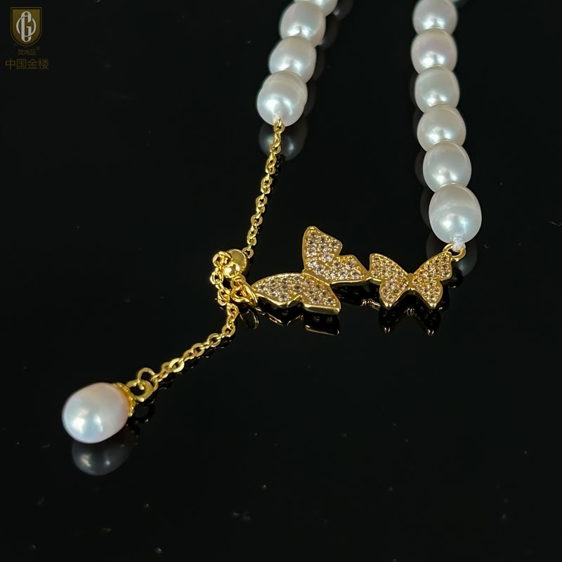 中国金楼梵尚品满钻双蝴蝶灵动珍珠项链ZZX02772682送礼送女友送长辈生日礼物(下单赠手机贴随机一个)