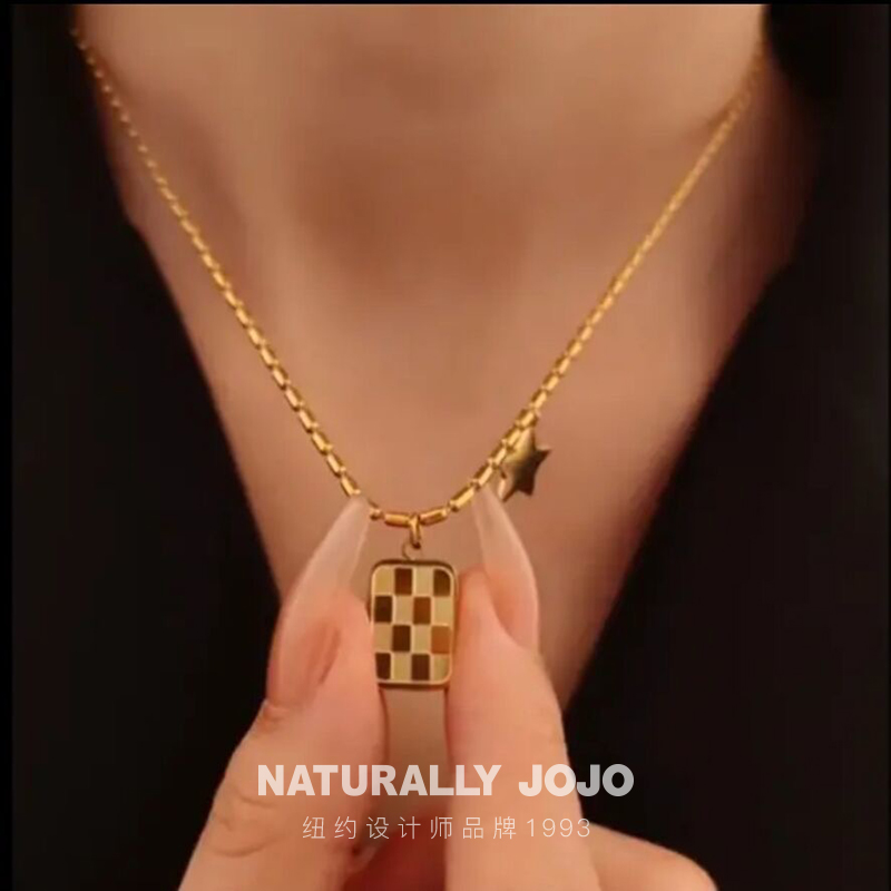 NATURALLY JOJO 女士轻奢ins小众设计新款钛钢棋盘格方牌星星项链女生气质项链