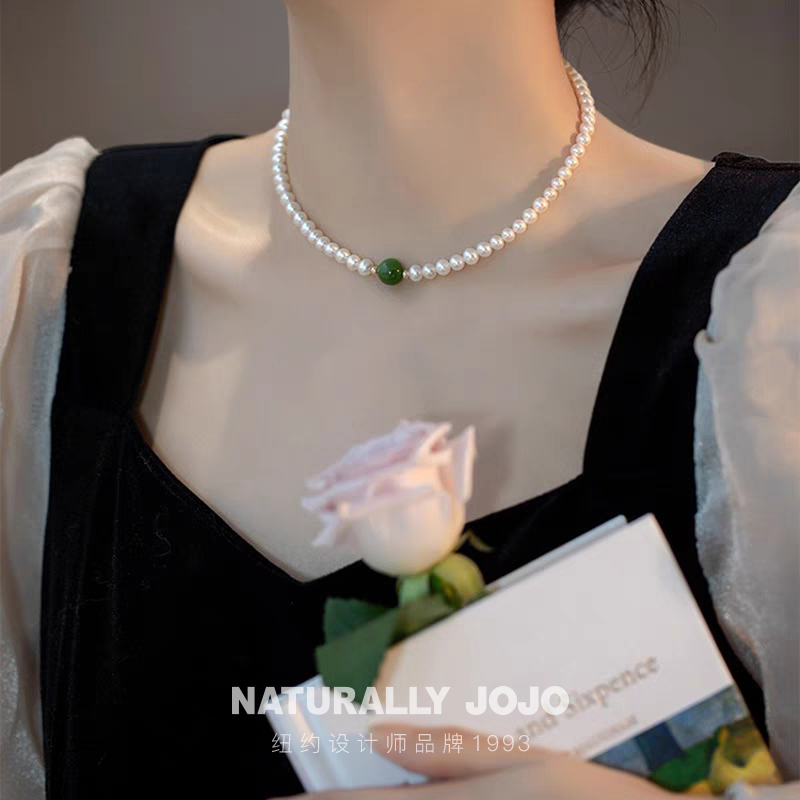 NATURALLY JOJO 女士新款轻奢复古气质和田玉淡水珍珠项链饰品锁骨链女生生日礼物配证书