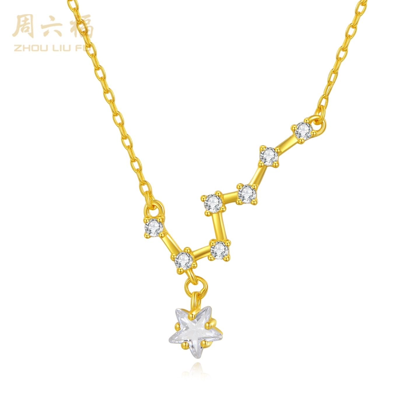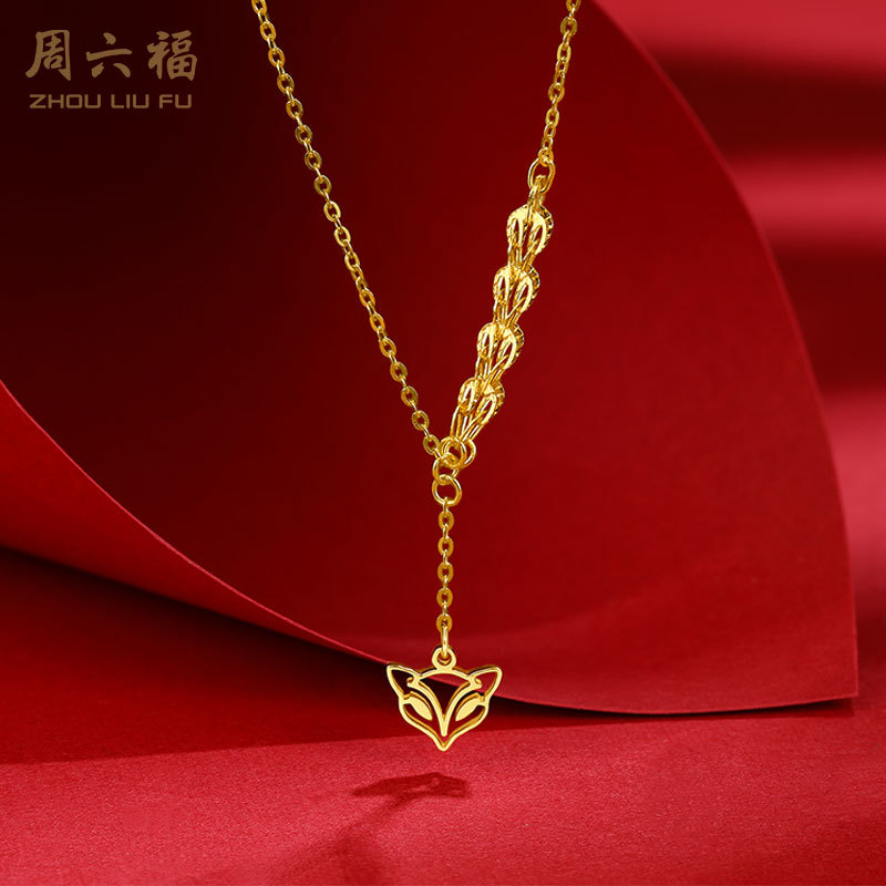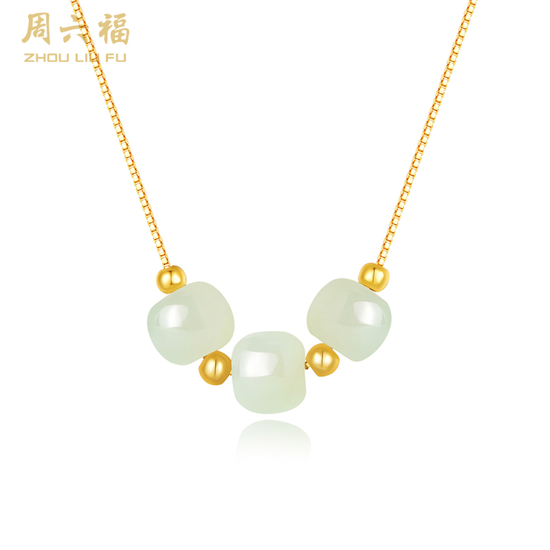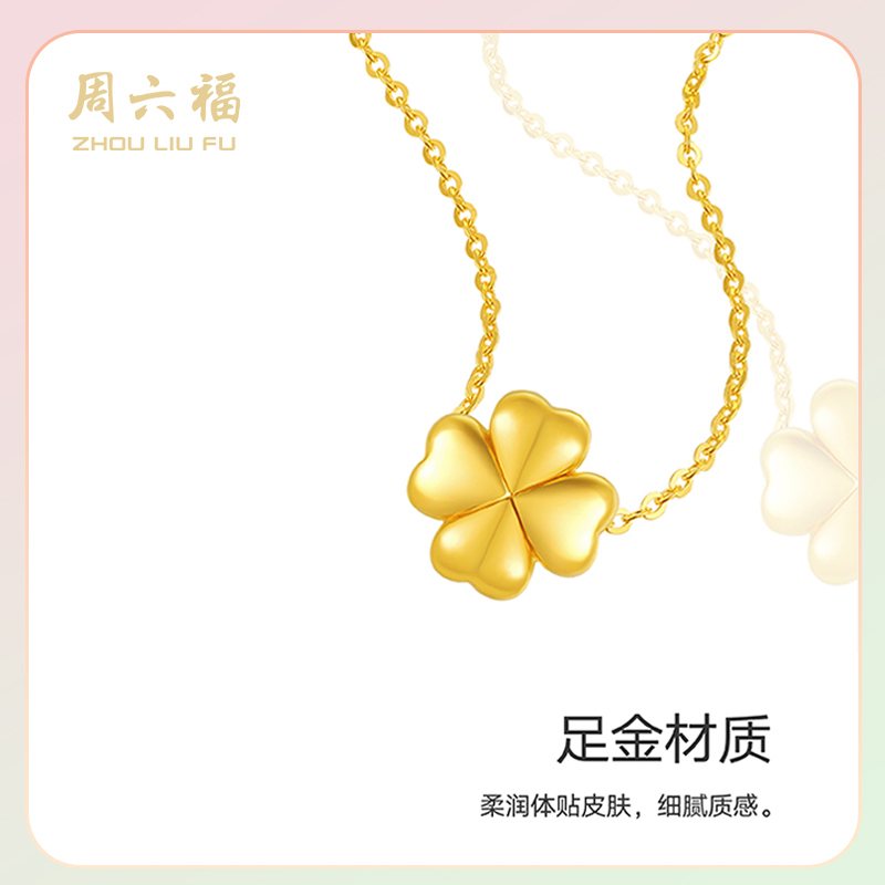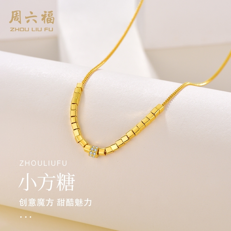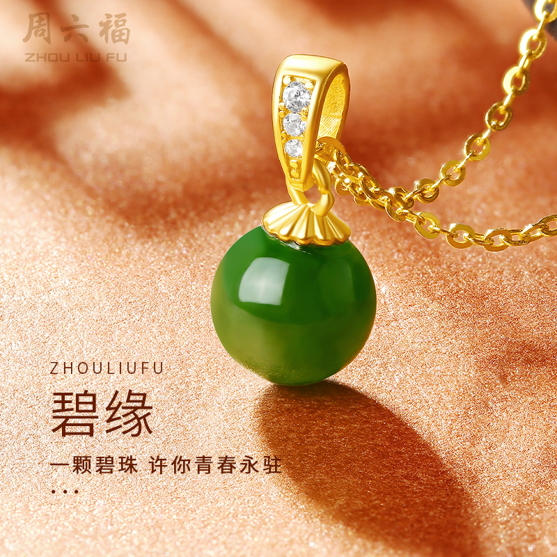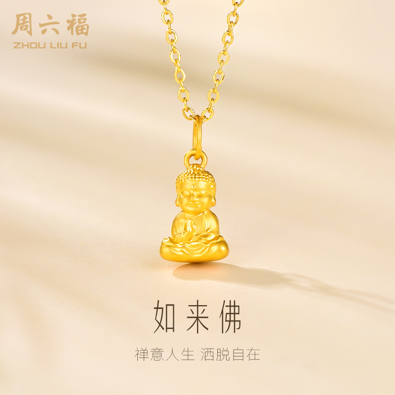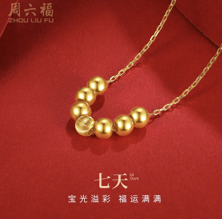 周六福足金亮面车花七天转运珠金珠吊坠项链