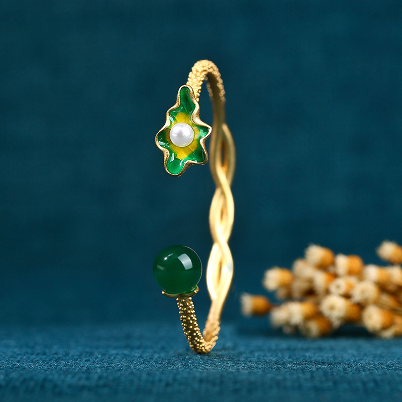 彤彤兔 民族宫廷风手饰古法饰品烧蓝合成玉石荷叶手镯手环