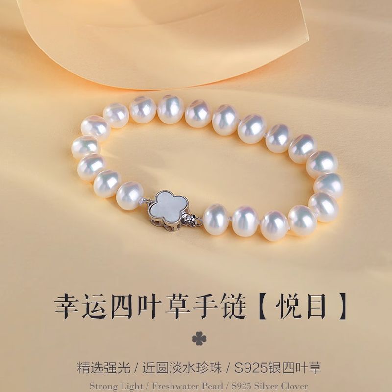 悦目8-9mm近圆形强光白色无核淡水珍珠手链S925银手串女