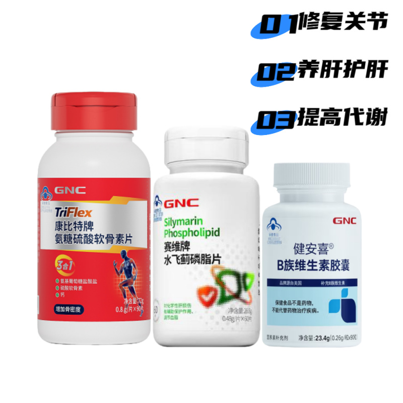【组合产品】GNC健安喜 氨糖硫酸软骨素片90片+B族维生素胶囊90粒+护肝片60粒