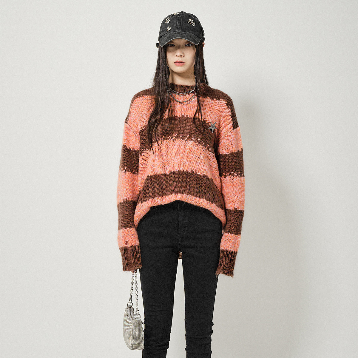 地素条纹套头毛衣春秋季慵懒金属胸针装饰长袖上衣女 811915
