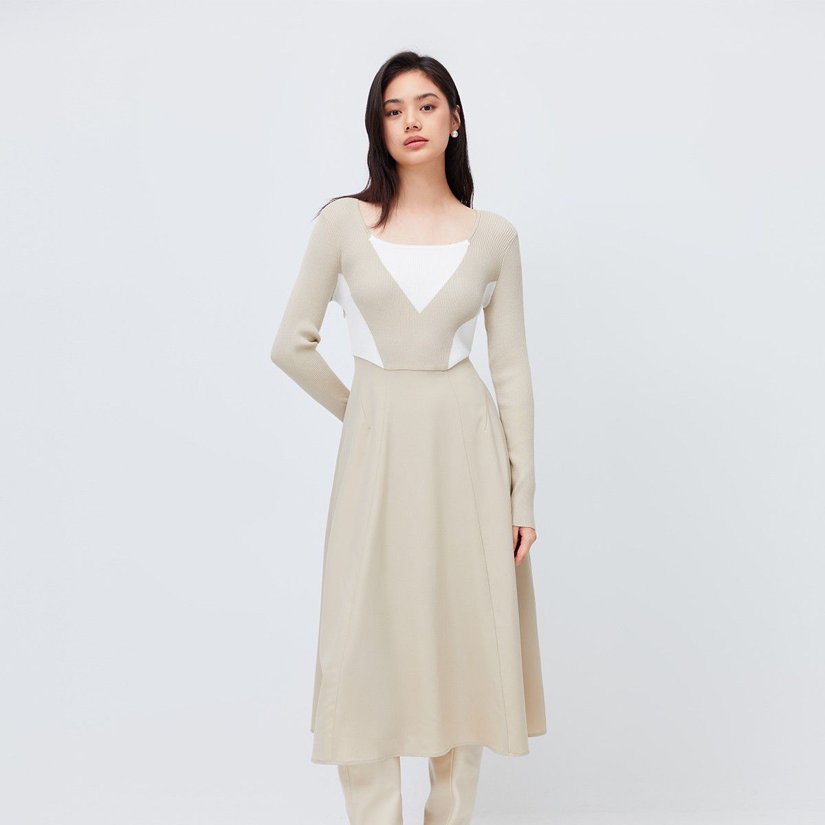 【收腰A字】春季方领中长款A字收腰针织连衣裙女 477274
