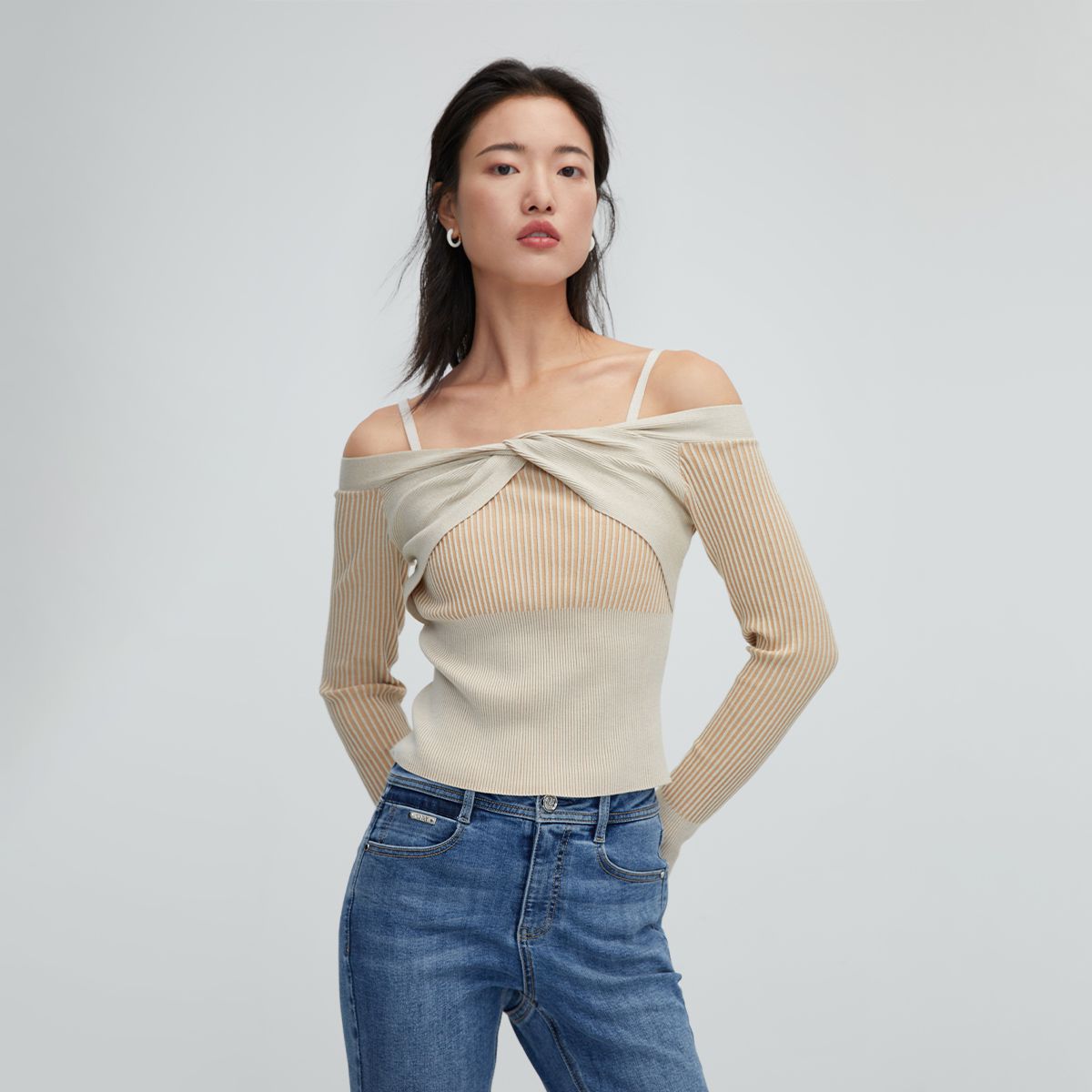 【一字领】春季设计感蝴蝶结短款螺纹修身针织衫女 289562