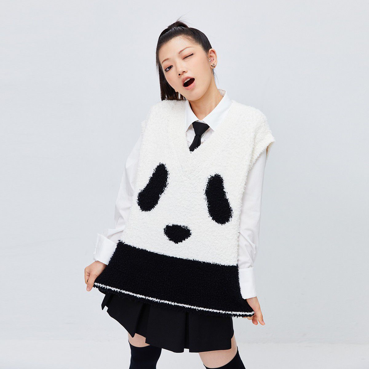 【可爱熊猫】春季休闲V领无袖宽松针织衫女 680474