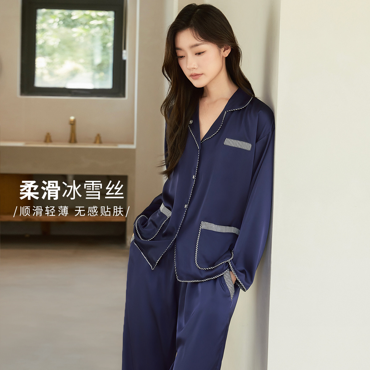 【撞色条纹冰雪丝】亲肤舒适居家女式家居服春秋长袖翻领睡衣套装 831371