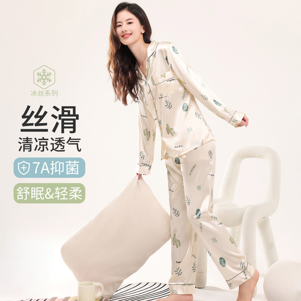 【7A抑菌】女士冰丝睡衣秋款长袖顺滑亲肤可外穿睡衣家居服套装 553355