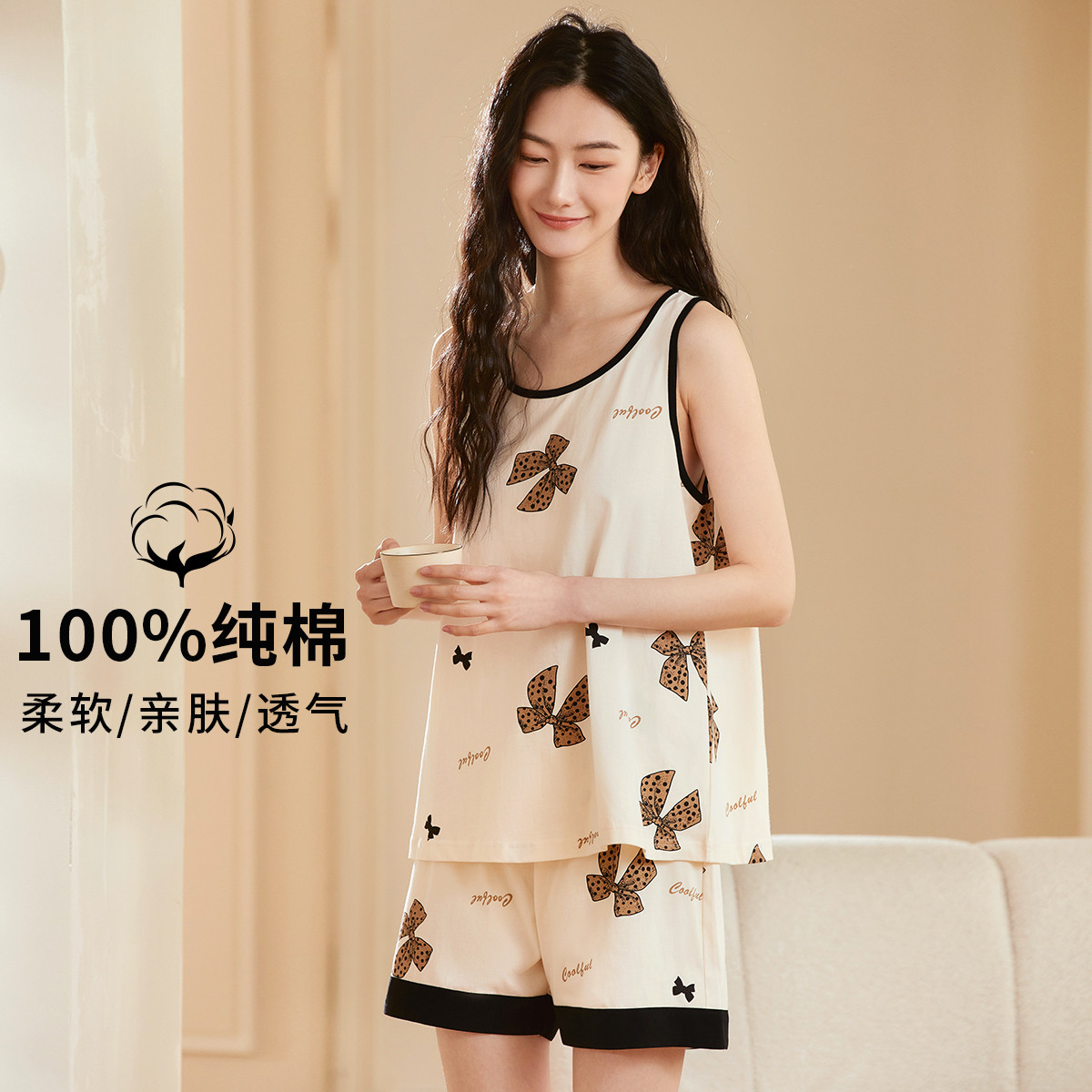 【100%棉】蝴蝶结印花圆领无袖背心套装女士家居服清爽透气 855499