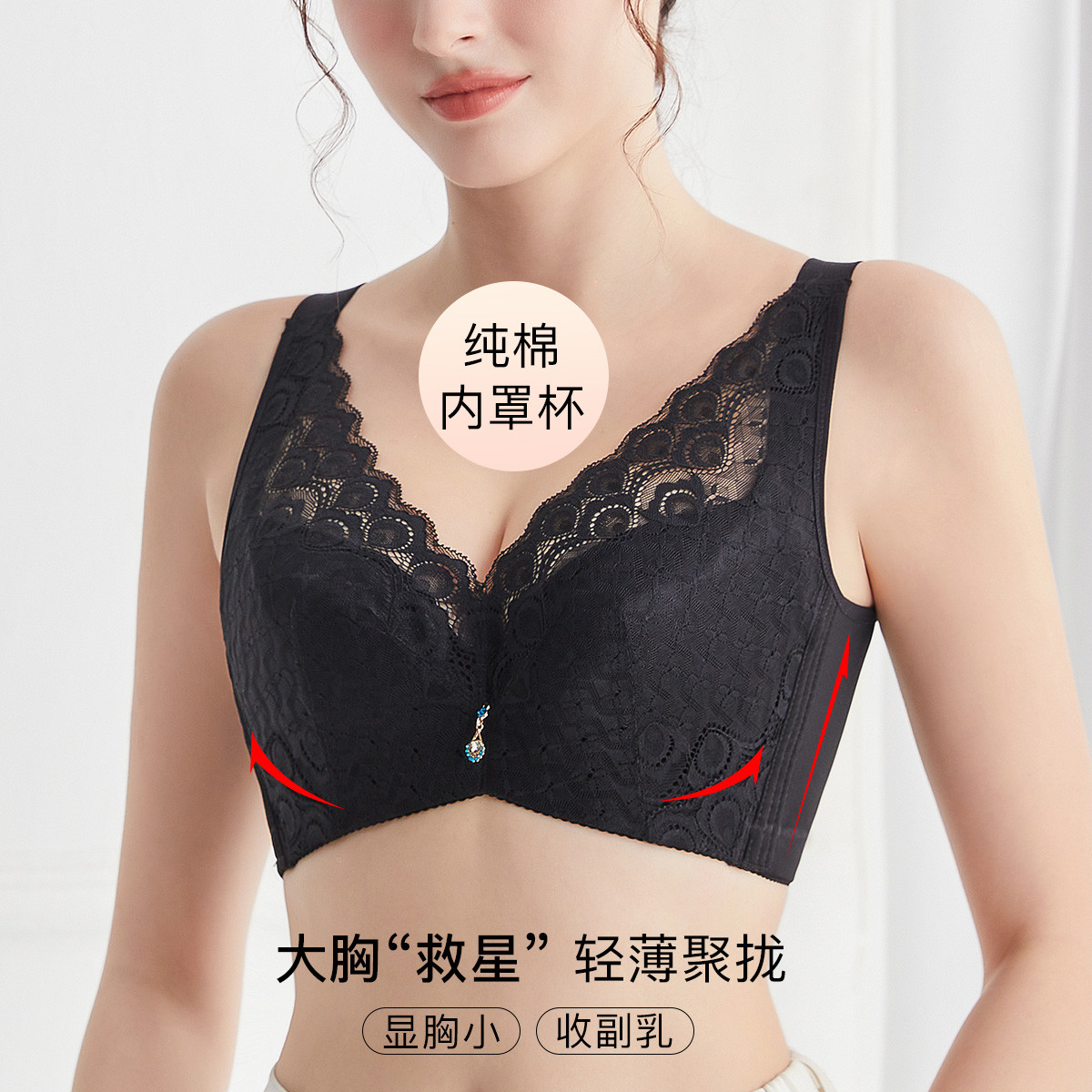 【100%纯棉里】大胸显小聚拢上托不空杯蕾丝性感美背文胸罩 619678