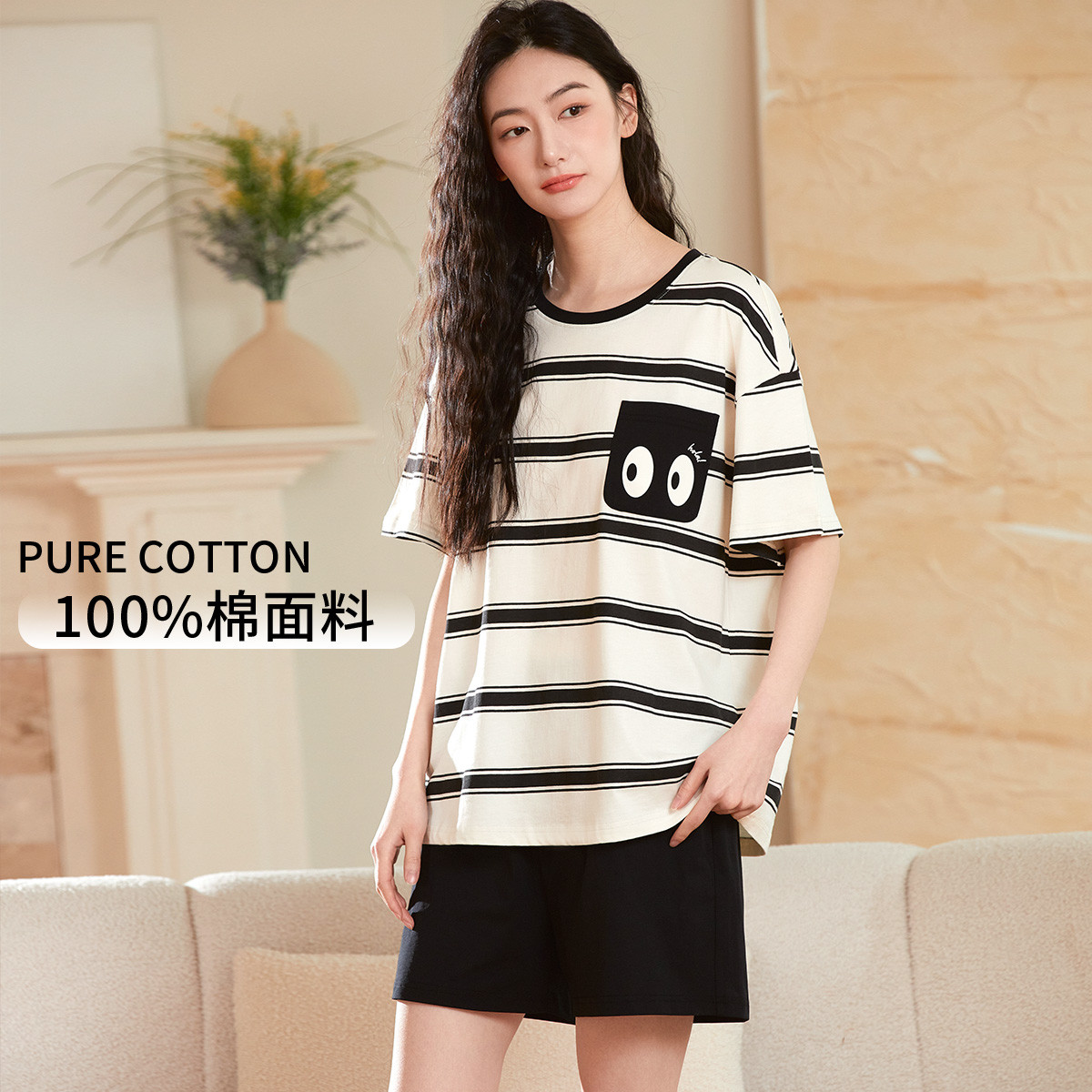 【100%棉】圆领条纹短袖大眼睛印花套装女士家居服柔软舒适 843211