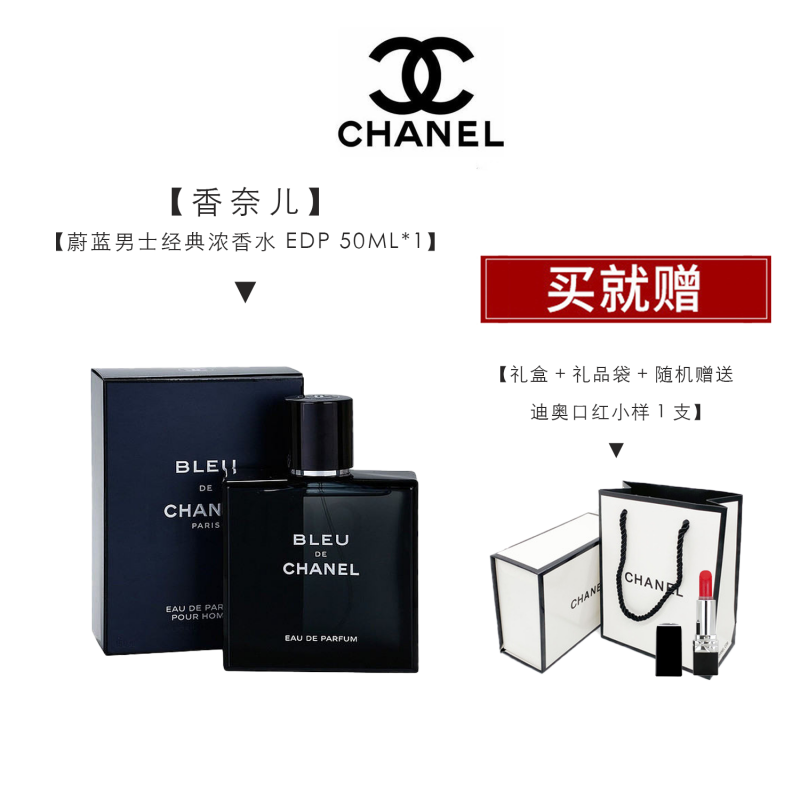 Chanel/香奈儿 蔚蓝男士经典浓香水 50m/l00ml 礼盒套装 礼盒+袋子+小样口红