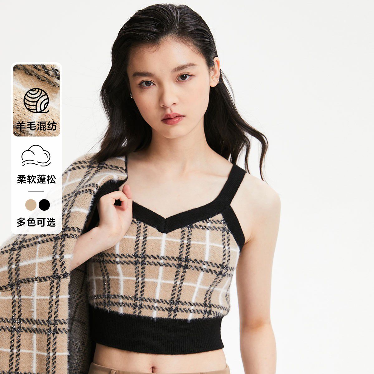 【秋冬专柜款】英伦风V领内搭格纹韩系针织吊带背心女 114065
