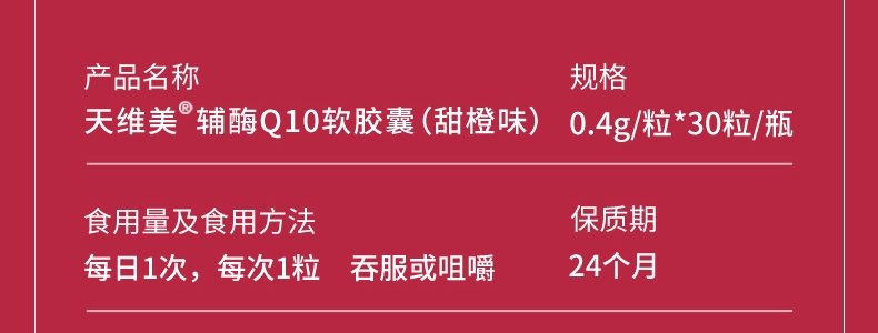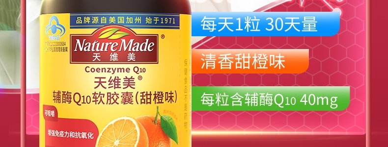 商品名称:天维美(NatureMade)辅酶Q10软胶囊(甜橙味)12g/瓶(30粒)