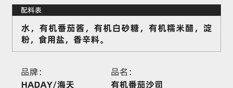 商品名称:海天 0添加有机番茄沙司 305g/瓶