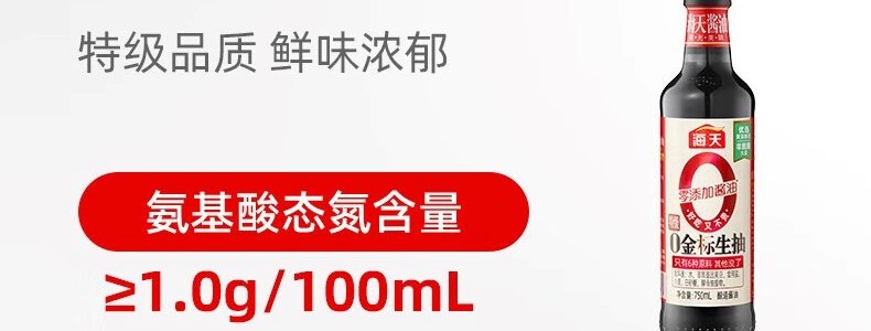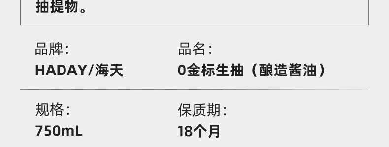 商品名称:海天 调味品组合装(老抽酱油750mL+0金标生抽750mL)(中华老字号)