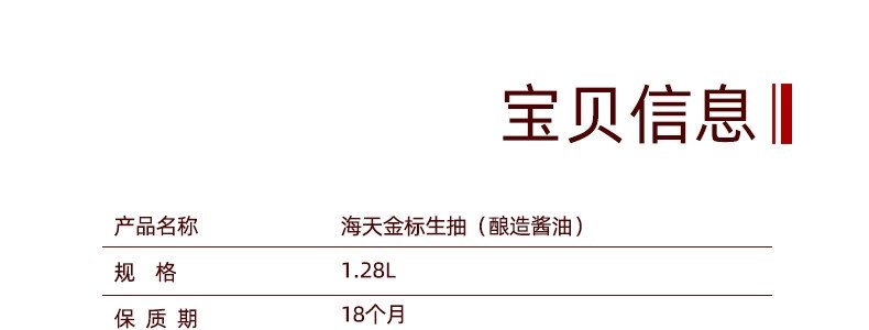 商品名称:海天 金标生抽1.28L+海天上等蚝油260g 调味品组合装(中华老字号)
