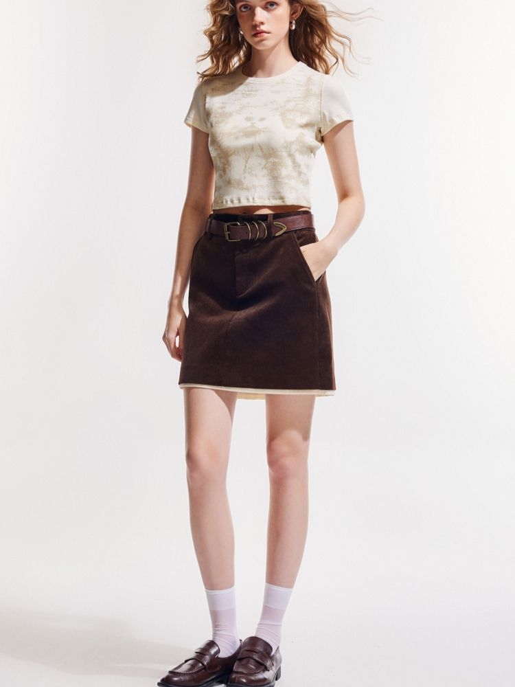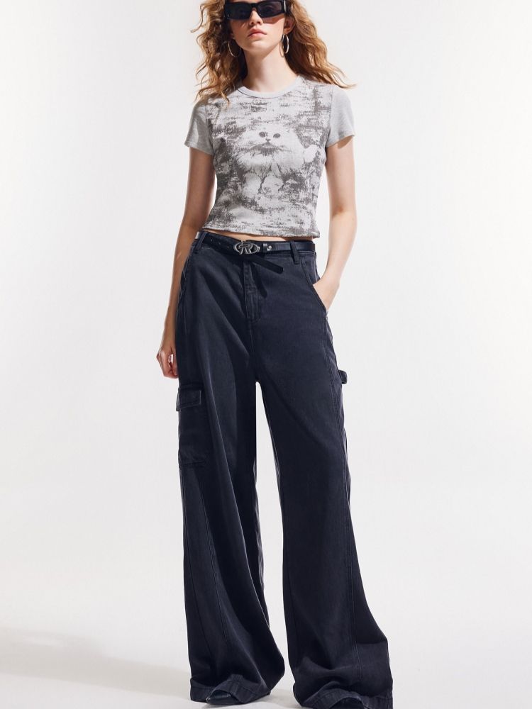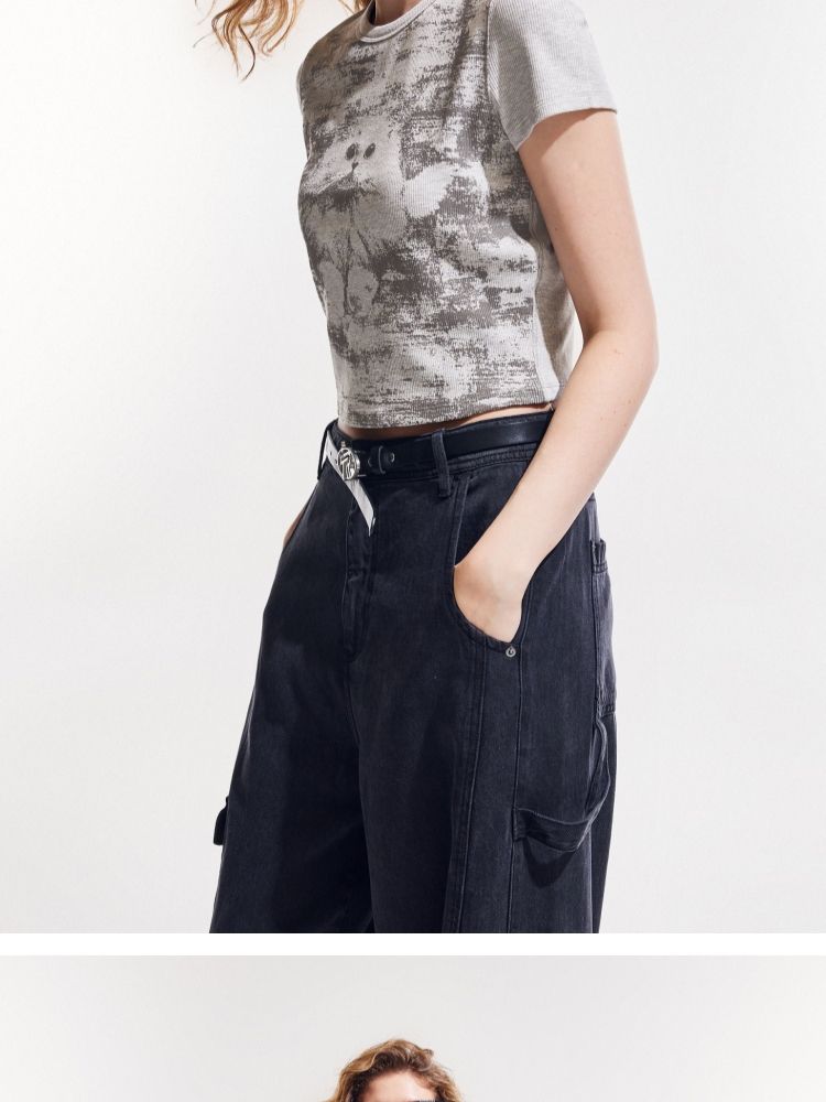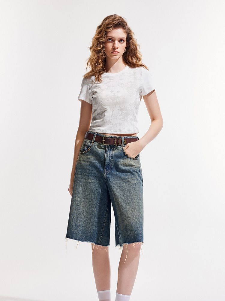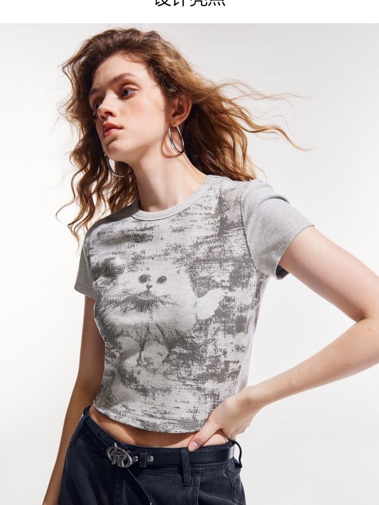 【做旧满印】2025夏新款时尚个性辣妹修身正肩短袖T恤女 568346