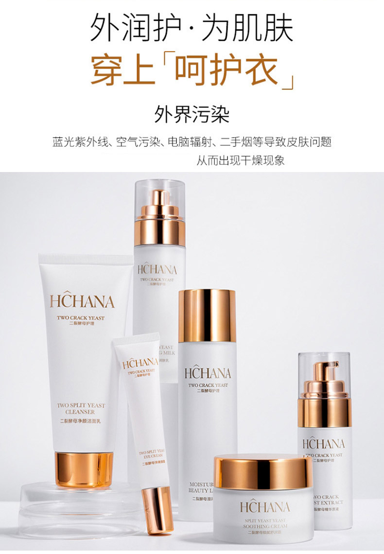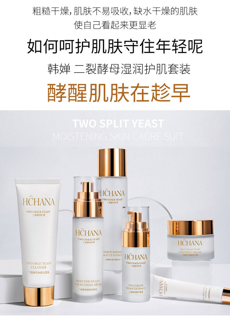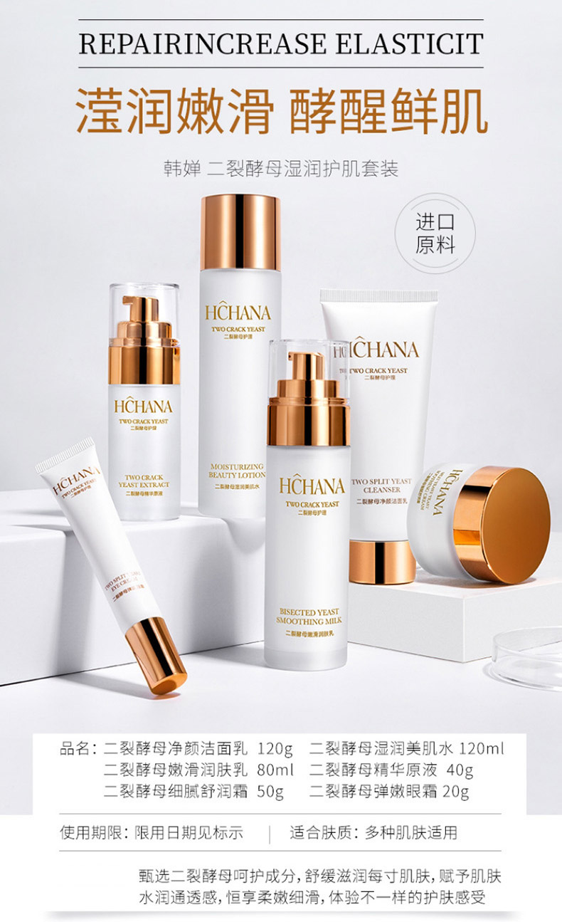 商品名称:韩婵二裂酵母湿润护肌套装 洁面乳+美肌水+润肤乳+精华原液+舒润霜+眼霜 护肤套装
