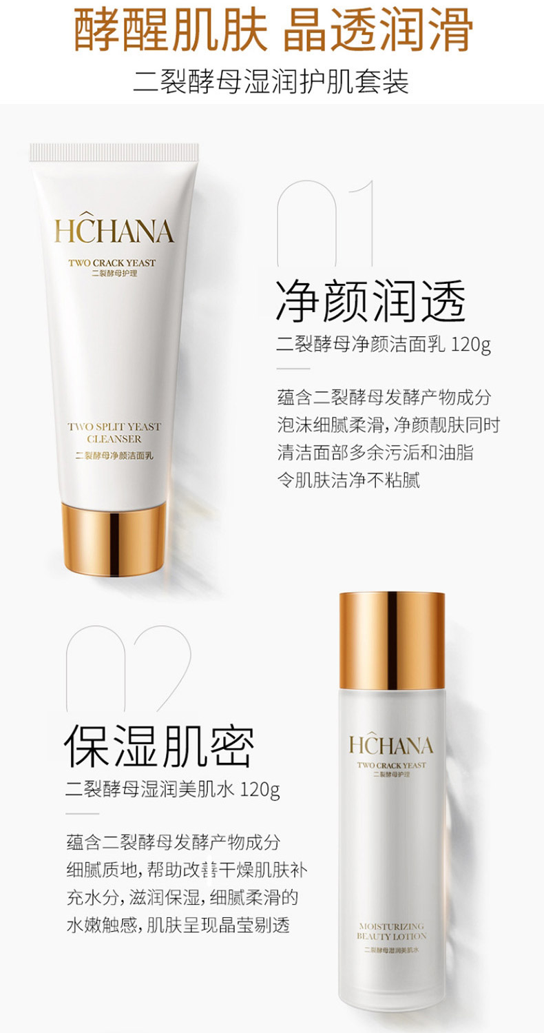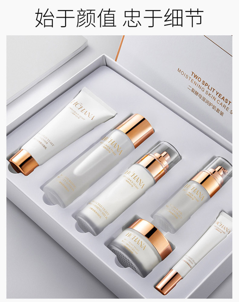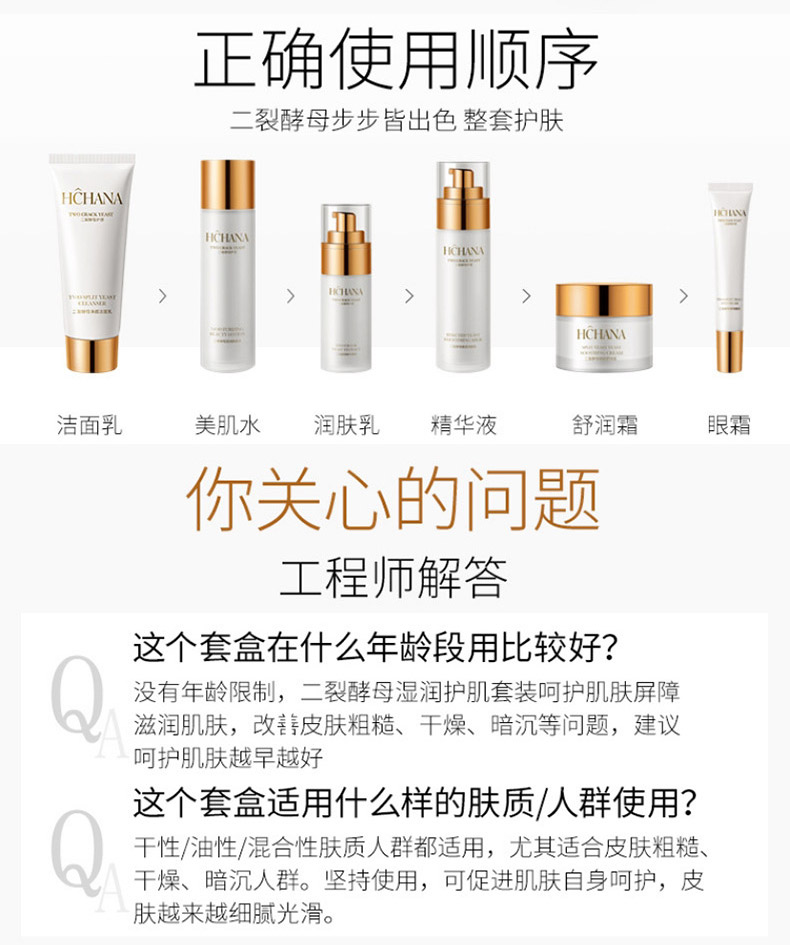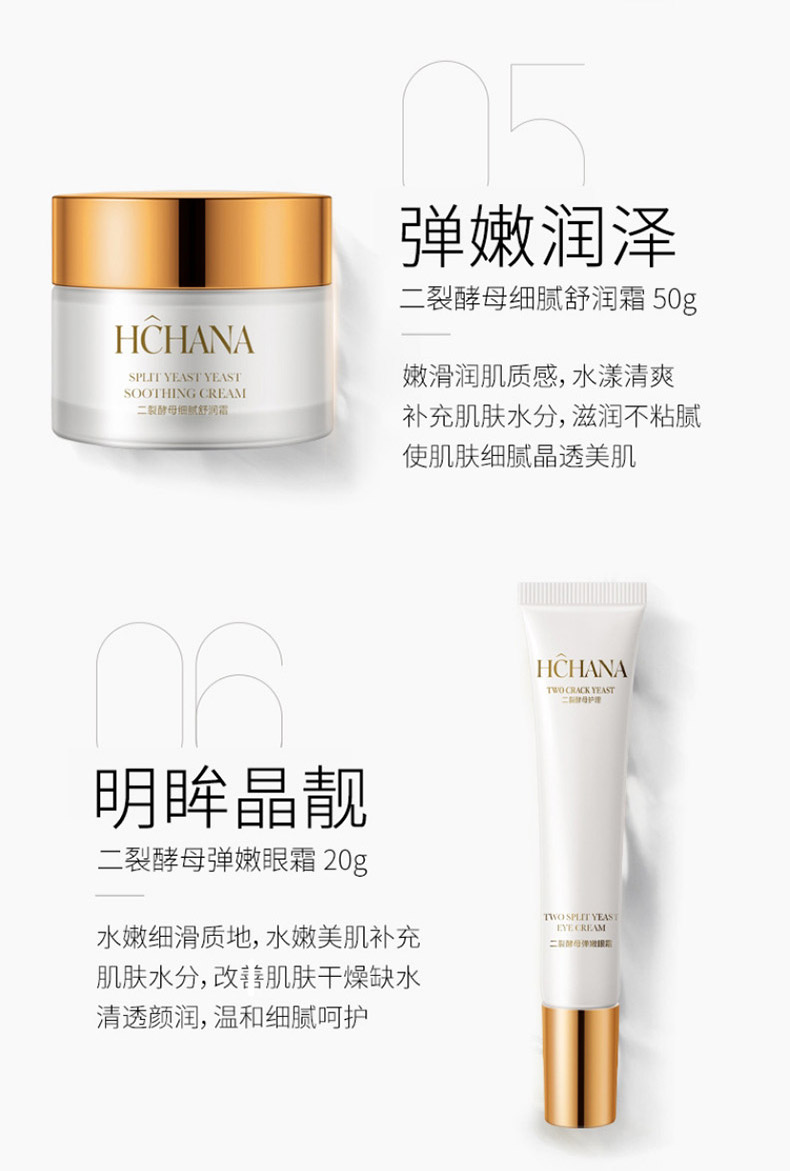 商品名称:韩婵二裂酵母湿润护肌套装 洁面乳+美肌水+润肤乳+精华原液+舒润霜+眼霜 护肤套装