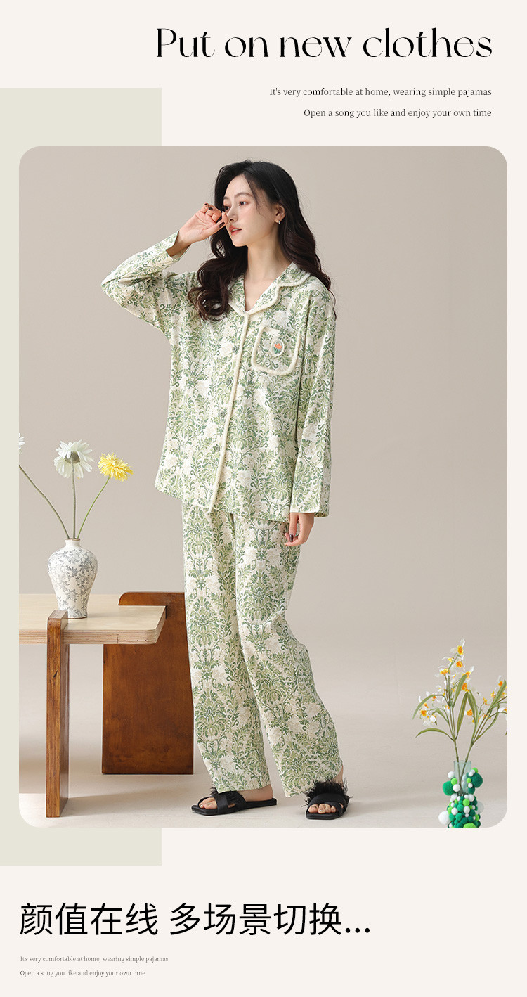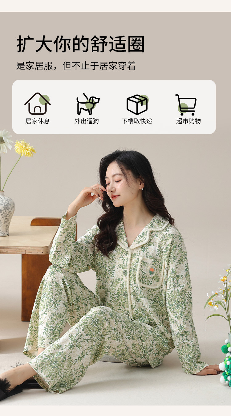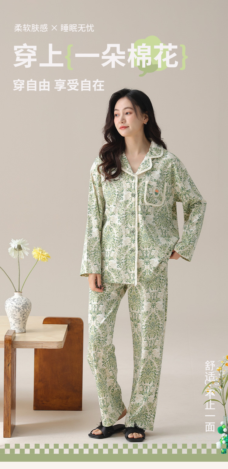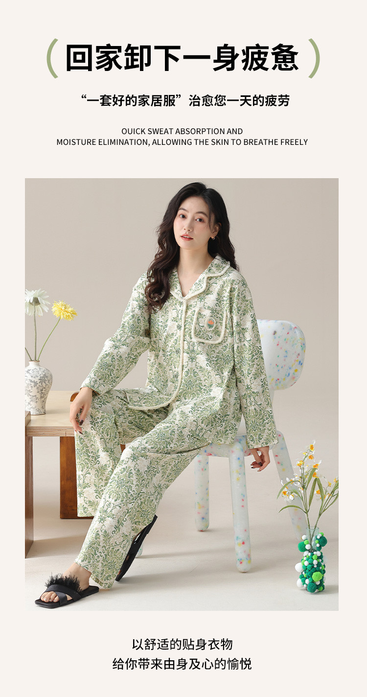 【植物花卉】春款长袖睡衣女士95%柔棉开衫家居服套装可外穿 133195
