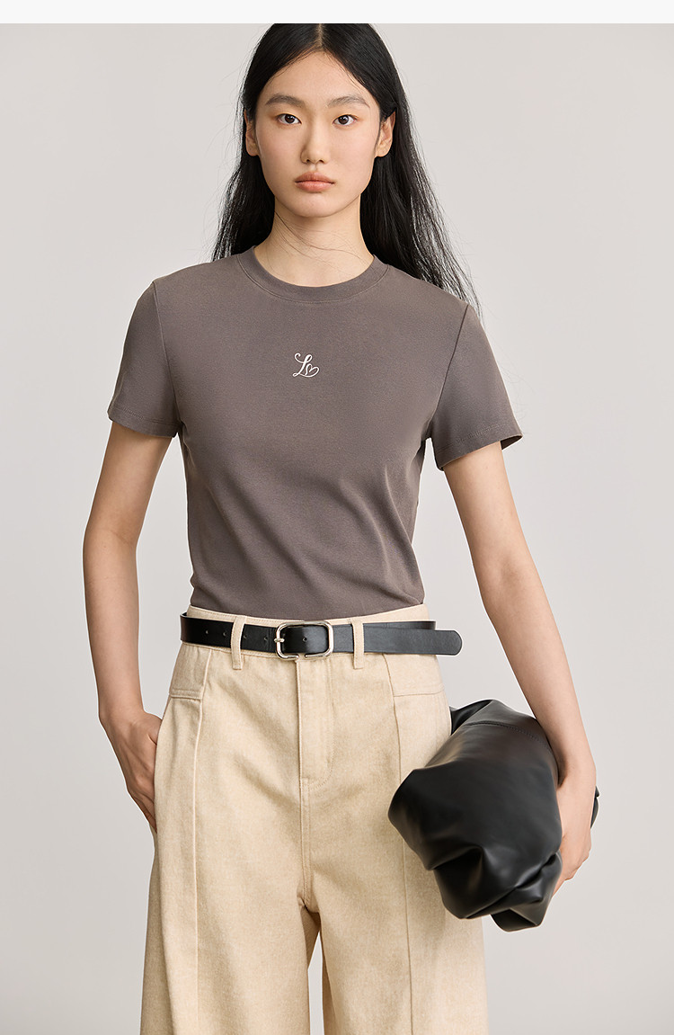 【2025春季】简约基础百搭通勤修身圆领咖啡色短袖T恤女短上衣 707419