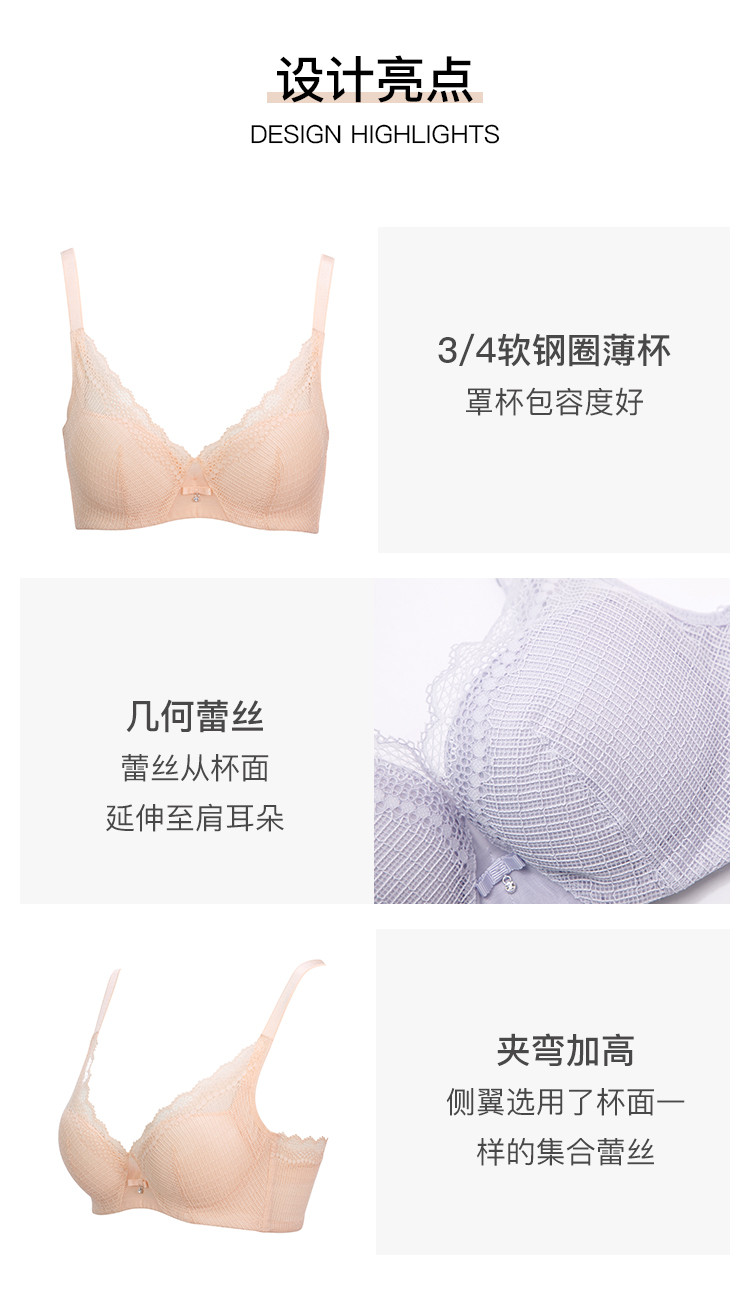 商品名称:【100%透气里杯】软钢圈聚拢上托几何蕾丝侧收副乳文胸罩内衣 123467