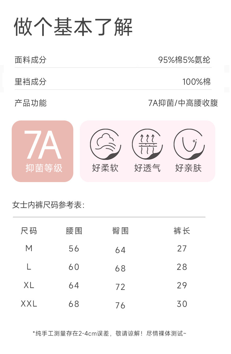 商品名称:【100纯棉抑菌裆】3条装中高腰收腹柔软透气女士内裤女短裤衩 939403
